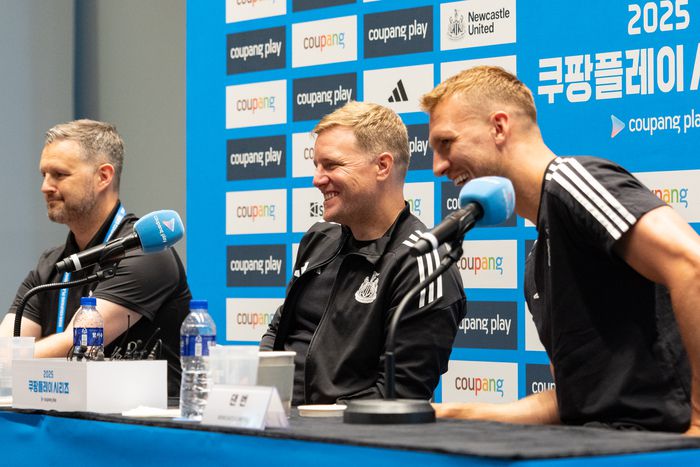 팀K리그와 프리시즌 친선전을 하루 앞둔 29일 기자회견에 참석한 뉴캐슬 유나이티드 에디 하우 감독과 댄 번. 사진 | 쿠팡플레이