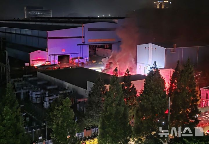[영암=뉴시스] 지난 28일 오후 11시22분께 전남 영암군 대불일반산업단지 HD현대삼호 내 1호사 변전소에서 불이 나 소방 당국이 진화 작업을 벌이고 있다. 이 불로 인명피해는 없는 것으로 파악됐지만 전력 공급이 끊겨 당분간 조업 차질도 예상된다. (사진 = 독자 제공) 2025.07.29. photo@newsis.com