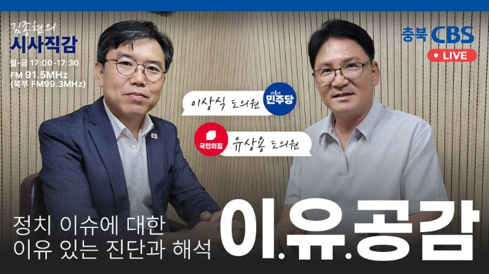 ◇ 김종현> 네. <시사직감> 오늘은 <이유공감> 코너로 진행합니다. 오늘로 여섯 번째 시간인데요. 더불어민주당 이상식 충북도의원, 국민의힘 유상용 충북도의원 '이','유' 두 정치인과 함께 이슈에 대한 이유 있는 진단과 해석으로 청취자들과 공감해 가는 토크 <이유공감> 시간입니다. 오늘 프로그램은 유튜브 충북 CBS를 통해서도 실시간 시청하실 수 있습니다. 오늘도 이재명 정부의 국정 운영, 날씨만큼 뜨거운 정치권 이슈, 그리고 지역 현안까지 시간이 허락하는 한 두루 이야기 나눠보도록 하죠. 이상식, 유상용 도의원 스튜디오에 나와 계십니다. 두 분 의원님, 안녕하십니까?