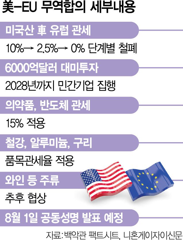 28일(현지 시간) 백악관은 팩트시트를 통해 “EU는 미국산 산업재에 대한 모든 관세를 철폐하는 것을 포함해 상당한 관세를 철폐할 것”이라고 밝혔다. EU 측은 일단 미국산 자동차 관세율을 10%에서 2.5%로 낮춘 후 결과적으로 무관세(0%)를 적용할 방침인 것으로 알려졌다. 또 EU의 6000억 달러(약 835조 원) 규모 대미 투자에 대해 백악관은 “도널드 트럼프 대통령 임기인 2028년까지 이뤄질 것”이라고 기한을 못 박았다. 더 나아가 앞서 진행된 투자와는 별개의 신규 투자라는 점도 강조했다. EU 측은 “일본의 경우 대출·융자 등 공적 자금이 투입되지만 EU는 민간 자금이 주축이 된다”고 밝혔다.