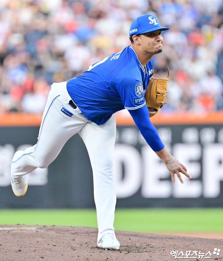 구자욱은 1타점 좌중간 적시 2루타를 때려냈다. 한화 중견수 리베라토가 공을 한 차례 더듬은 사이 김성윤도 홈으로 들어오려 했지만 태그아웃됐다. 점수는 6-0. 이어 디아즈가 1타점 중전 적시 2루타로 7-0을 빚었다. 강민호는 1루 파울플라이에 그쳤다.
