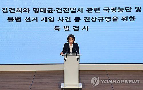 김건희 특검 브리핑(서울=연합뉴스) 서대연 기자 = 윤석열 전 대통령 부인 김건희 여사와 관련한 각종 의혹 사건을 수사하는 민중기 특별검사팀 오정희 특검보가 8일 서울 종로구 KT광화문빌딩에서 정례 브리핑을 하고 있다. 2025.7.8 dwise@yna.co.kr