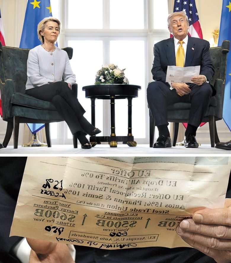 27일 도널드 트럼프(오른쪽) 미국 대통령과 우르줄라 폰데어라이엔 EU(유럽연합) 집행위원장이 스코틀랜드에 있는 트럼프의 턴베리 골프장에서 만나 관세 협상 타결을 발표하고 있다. 트럼프는 관세와 투자액 등을 정리한 종이를 들고 있는데, 일부 내용을 수정한 펜 글씨가 비쳐 보인다(작은 사진). 미국이 EU에 부과하는 관세는 30%에서 15%로 고쳐졌다. EU의 대미 투자액은 5000억달러에서 6000억달러로, EU의 미 에너지 구입 규모는 6000억달러에서 7500억달러로 각각 수정됐다. 미·일 협상 때와 마찬가지로 트럼프가 즉석에서 협상 내용을 고친 것으로 추정된다. /AP 연합뉴스 |