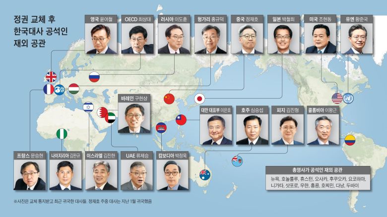 본지 취재를 종합하면, 정부는 지난달 말 조현동 주미 대사, 박철희 주일 대사, 이도훈 주러시아 대사, 황준국 주유엔 대사 등에게 “7월 14일까지 귀국하라”고 지시했다. 이들 외에도 윤여철 주영국 대사, 문승현 주프랑스 대사, 김진한 주이스라엘 대사, 류제승 주UAE 대사, 홍규덕 주헝가리 대사 등도 교체 대상에 포함돼 귀국했다. 진창수 주오사카 총영사, 김의환 주뉴욕 총영사, 이서영 주호놀룰루 총영사, 이범찬 주두바이 총영사 등은 18일까지 귀국했다.
