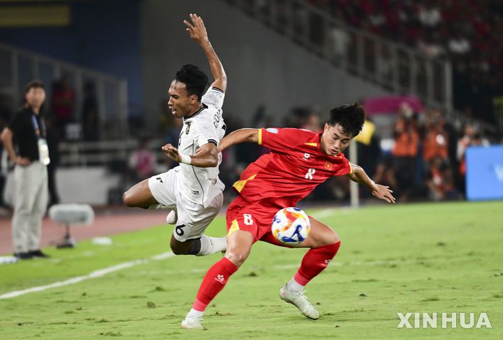 [자카르타=신화/뉴시스] 베트남 23세 이하(U-23) 축구 대표팀의 응우옌 반 뜨엉(오른쪽) 29일(현지 시간) 인도네시아 자카르타의 겔로라 붕 카르노 스타디움에서 열린 2025 아세안축구연맹(AFF) U-23 챔피언십 결승전 인도네시아와 경기 중 공을 다투고 있다. 김상식 감독이 이끄는 베트남은 전반 37분 응우옌 꽁 프엉의 선제골을 지켜 1-0으로 승리하고 대회 3연패를 달성했다. 2025.07.30.