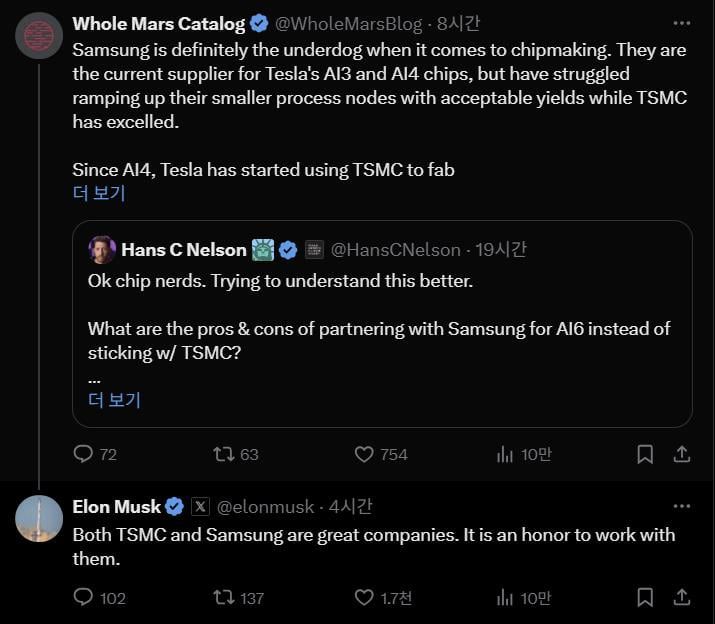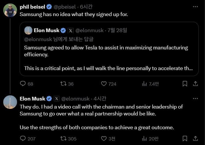 머스크는 삼성전자의 기술력에 대해서도 두둔했다. 한 X 이용자는 삼성전자와 대만 TSMC의 기술력을 비교하며, “테슬라의 AI6 칩이 삼성전자의 새로운 2나노 기술로 만들어지지만, 여전히 삼성이 그것을 해낼 수 있는지 미지수”라는 글을 올렸다. 이에 일론 머스크는 답글을 달고 “TSMC와 삼성 둘다 훌륭한 회사다. 그들과 함께 일하게 된 것은 영광이다”라고 했다.