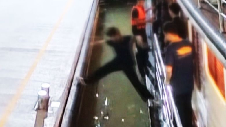 그 순간 여러 직원이 달려왔고 물에 빠진 남성을 구조하는 동시에 배가 선착장에 닿지 않기 위해 최소 6명이 온 힘을 다해 밀어냈습니다.
