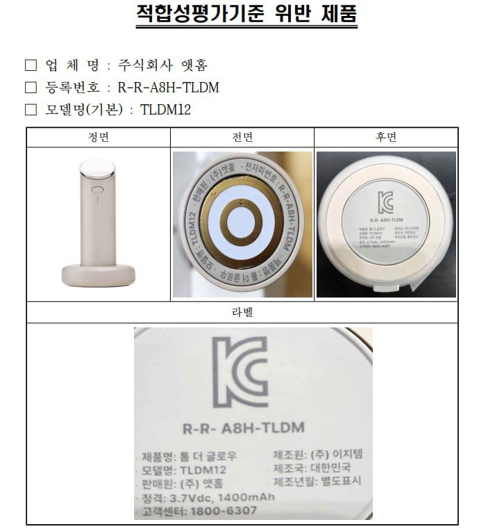 앳홈의 뷰티 디바이스 '톰 더 글로우'가 국립전파연구원으로부터 적합성평가기준 위반을 이유로 시정명령 및 1개월간 생산·수입·판매중지 행정처분을 받았다. /국립전파연구원 제공 |