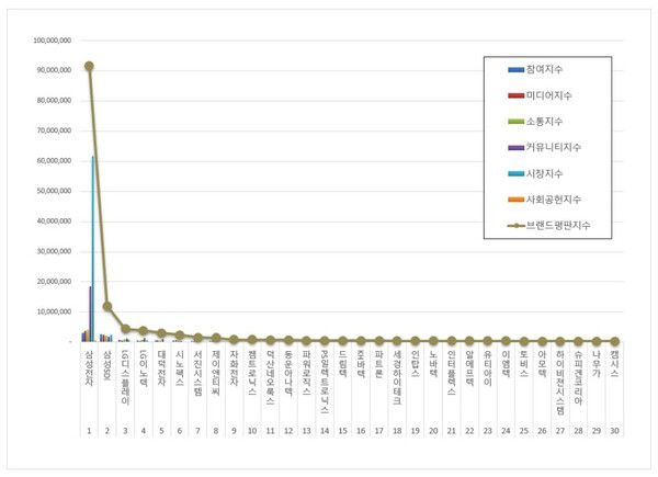 2위, 삼성SDI 브랜드는 참여지수 2,742,862 미디어지수 2,415,457 소통지수 2,286,613 커뮤니티지수 1,909,416 시장지수 2,407,958 사회공헌지수 238,939가 되면서 브랜드평판지수 12,001,245로 분석됐다. 지난 5월 브랜드평판지수 10,095,370과 비교해보면 18.88% 상승했다.