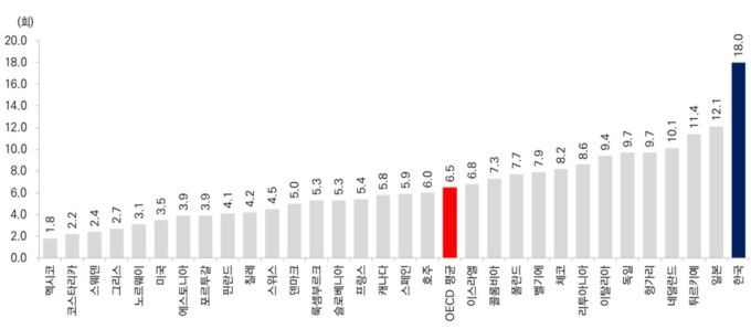 반면 의료장비는 OECD 국가에 비해 많은 상황이다. 자기공명영상장치(MRI) 장비 수는 인구 100만 명당 38.7대로 집계됐다. OECD 평균(21.2대)보다 많다. 컴퓨터단층촬영(CT) 장비 수는 100만 명당 45.3대로 OECD 평균(31.1대)보다 높게 나타났다. 병원·병상 수도 인구 1000명당 12.6개로 OECD 평균(4.2개)의 약 3배 수준으로 나타났다.