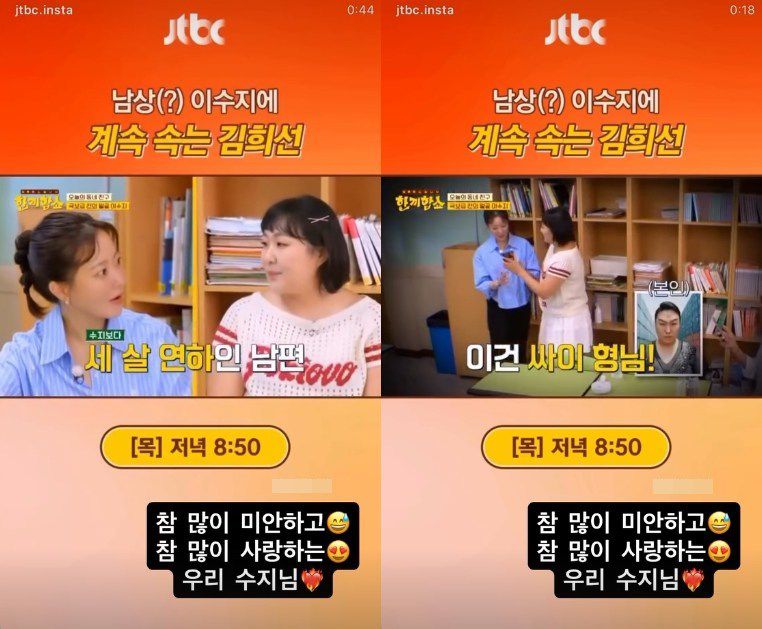 김희선은 "참 많이 미안하고 참 많이 사랑하는 우리 수지님"이라며 짧은 '한끼합쇼' 영상을 공유했다. 공유된 방송 화면에는 남상(?) 이수지에 계속해서 속는 김희선이 담겨 웃음을 자아냈다.