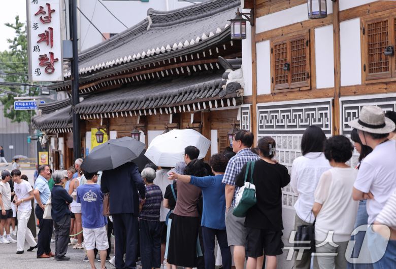 절기상 중복인 30일 서울 종로구의 한 삼계탕 전문점을 찾은 외국인 관광객과 시민들이 점심식사를 위해 줄지어 대기하고 있다. 2025.7.30/뉴스1 ⓒ News1 박지혜 기자