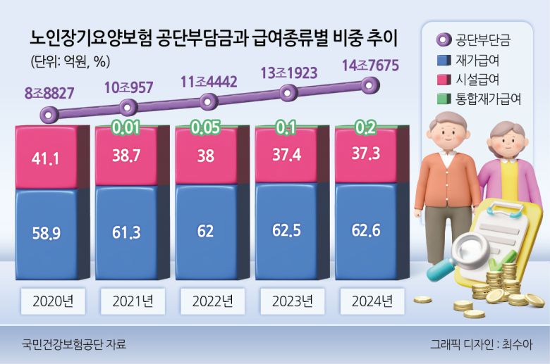 재가 돌봄 서비스에 대한 수요는 갈수록 커지고 있다. 지난해 노인장기요양보험 통계 보면 국민건강보험공단 부담 기준으로 재가급여는 62.6%, 시설급여는 37.3%를 차지하는 등 집에서의 돌봄이 대세를 이뤘다. 집에서 다양한 재가 서비스를 한 번에 맞춤형으로 받을 수 있도록 설계된 통합재가급여의 경우 같은 기간 74.2% 급증하기도 했다.