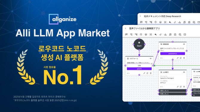 [이데일리 김현아 기자]올거나이즈(대표 이창수)는 자사의 거대언어모델(LLM)기반 올인원 솔루션 ‘알리(Alli)’가 일본 생성형 AI 앱 개발 플랫폼 시장에서 점유율 1위를 기록했다고 30일 밝혔다.