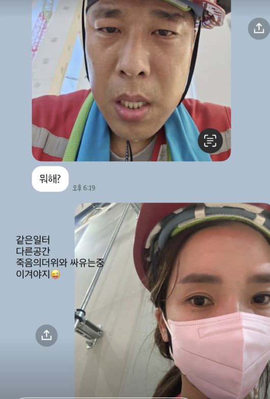 공개된 메시지에는 안전모를 눌러쓴 김동성이 땀에 젖은 얼굴로 "뭐해?"라고 물었고, 인민정은 같은 복장으로 작업 중인 자신의 모습을 보내며 서로의 근무 상황을 공유했다.