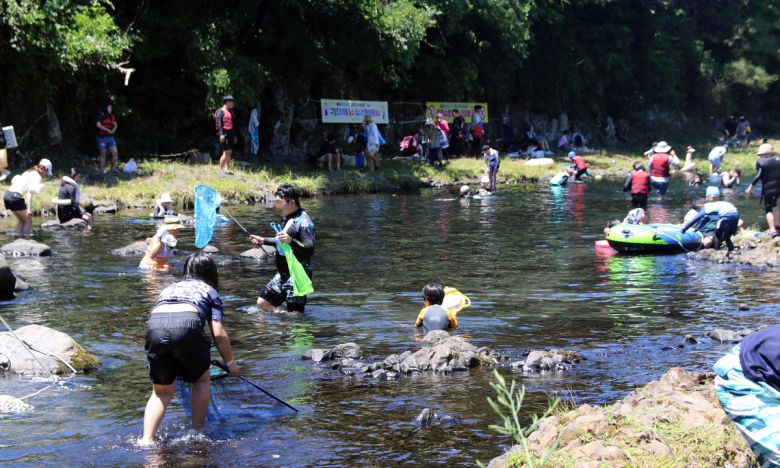 26일 오후 제주 서귀포시 강정천을 찾은 관광객들이 물놀이를 즐기고 있다. 뉴스1
