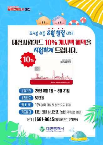 대전시 8월 한달간 지역사랑상품권(지역화폐)인 '대전사랑카드'의 캐시백 비율을 기존 7%에서 10%로 확대 지원한다고 30일 밝혔다.