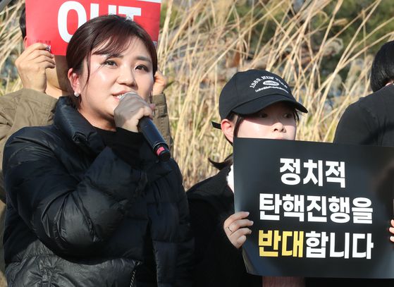 김소연 변호사 등이 3월 11일 대전 유성구 한국과학기술원(KAIST) 정문 앞에서 기자회견을 열고 윤석열 대통령 탄핵 반대 비상시국선언을 하고 있다. 뉴스1