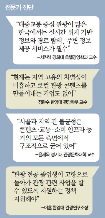 전문가들은 ‘전국 단위 관광업 확산’ 없이는 지속 불가능하다고 강조한다. 지방 관광 활성화는 단순 홍보나 이벤트 만으로는 어렵다. 여행 전 과정에 걸친 인프라 보완과 지역 차별화 콘텐츠 마련이 절실하다. 정란수 한양대 관광학부 교수는 “외국인 관광객 입장에서는 편리한 이동과 숙박, 그리고 다양한 즐길 거리가 있어야 지방을 찾는다”며 “현재는 지역 고유의 차별성이 미흡하고 로컬 관광 콘텐츠를 만들어내는 기업도 없다”고 지적했다.