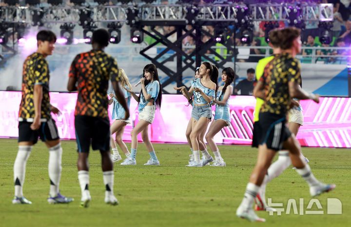 [수원=뉴시스] 이영환 기자 = 30일 오후 경기 수원시 팔달구 수원월드컵경기장에서 열린 2025 쿠팡플레이 시리즈 뉴캐슬 유나이티드와 팀 K리그의 경기 하프타임 시간에 그룹 아이브가 공연을 하고 있다. 2025.07.30. 20hwan@newsis.com