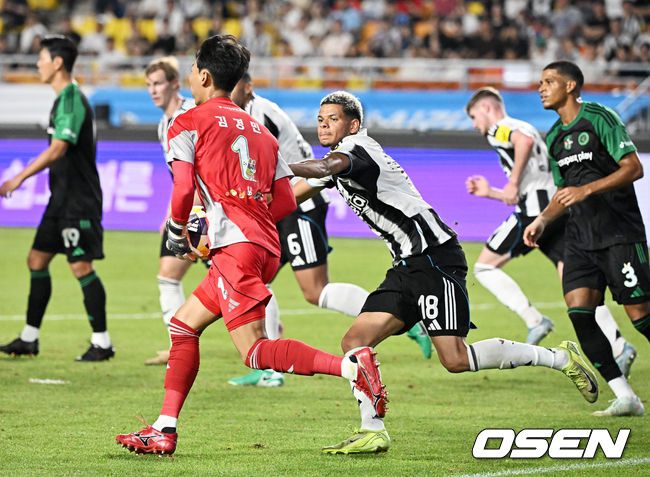 후반 뉴캐슬 윌 오슬라가 팀 K리그 김경민 골키퍼의 속공 시도를 막고 있다. 2025.07.30 / jpnews@osen.co.kr