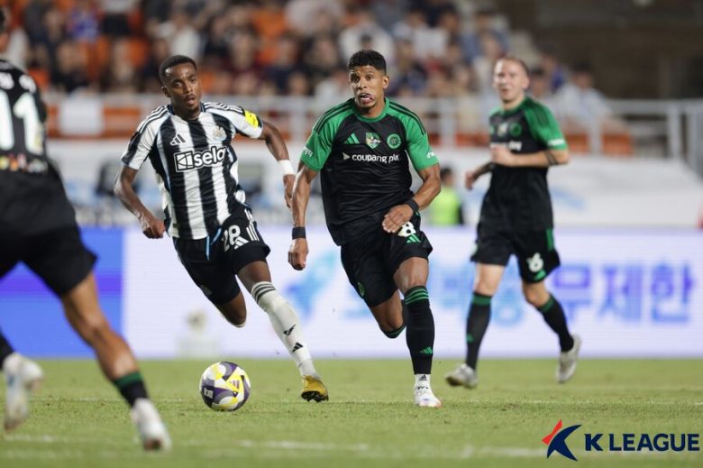 팀K리그의 첫 슈팅도 이동경이 때렸다. 전반 6분 뉴캐슬의 후방 빌드업 과정에서 실책이 나왔다. 볼을 탈취한 전진우가 박스 안의 모따에게 연결했다. 이어 모따는 상대 수비를 등지고 뒤쪽에 있던 이동경에게 정확한 패스를 내줬다. 이동경은 지체없이 강력한 왼발 슈팅을 떄렸으나 골대를 쌀짝 벗어났다.