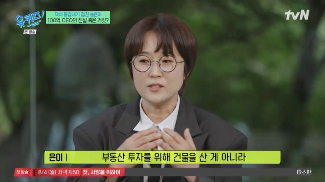 이에 조세호는 “제가 듣기론 회사 사옥이 현 시세로 70억 정도 한다더라”며 100억 CEO설에 박차를 가했고, 송은이는 “투자 목적이 아니다. 건물 어디서든 콘텐츠를 찍을 수 있게 만들자. 시설에 투자했다고 보면 될 것 같다”고 말했다.