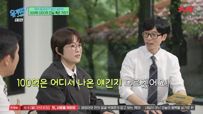 이날 유재석은 송은이를 소개하며 “상암동에 의리의리한 건물도 갖고 있다. 수식어로 ‘100억 CEO’가 붙는다”고 감탄했고, 송은이는 “조가 있으신 분인데, 100억 따위가”라고 쑥스러워했다.