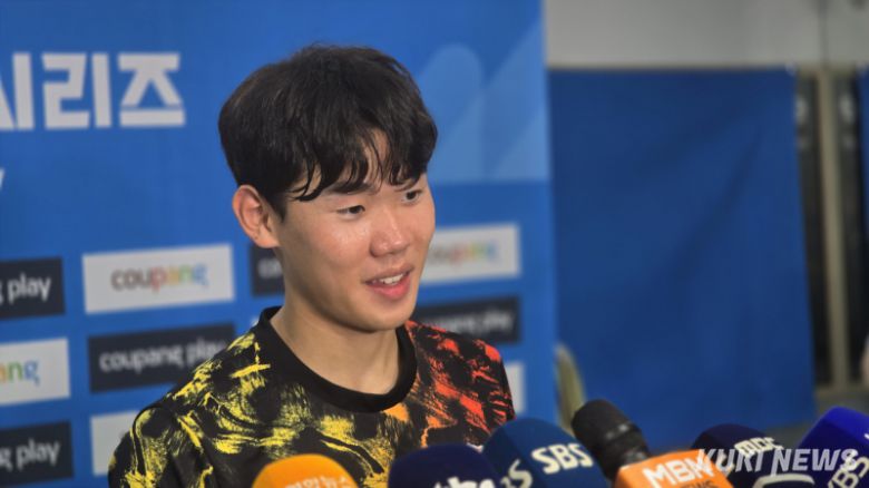 박승수가 30일 오후 8시 수원월드컵경기장에서 열린 ‘2025 쿠팡플레이 시리즈’ 팀 K리그와 경기가 끝난 뒤 믹스트존 인터뷰에 임하고 있다. 김영건 기자 |