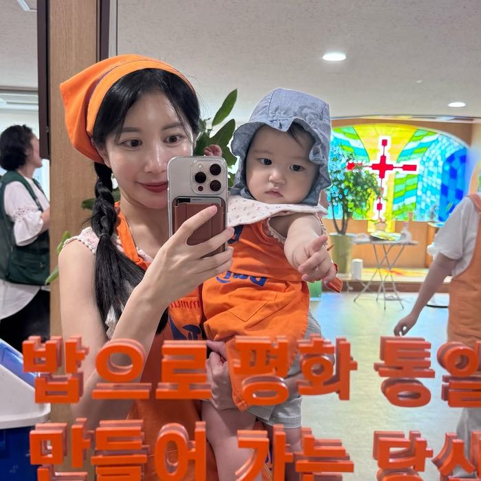 함께 게시된 사진 속에는 밝은 주황색 밥퍼 봉사 앞치마와 모자를 맞춰 입은 가족의 밝고 따뜻한 모습이 담겼다.
