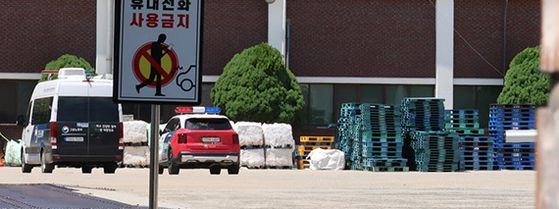 노동자 사망사고가 발생한 한솔제지에 대해 고용노동부와 경찰이 30일 강제수사에 착수했다. 이날 오전 한솔제지 신탄진공장에 압수수색 수사관들이 타고 온 차량이 주차돼 있다. [연합뉴스]