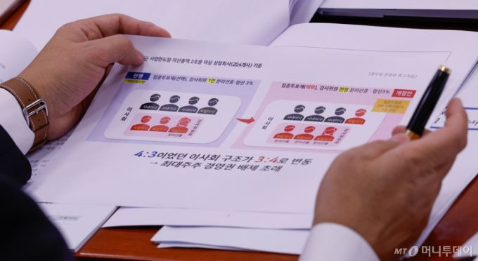 지난 11일 오후 서울 여의도 국회 법제사법위원회 회의실에서 열린 상법 개정안 관련 공청회에서 김용민 법안심사제1소위원장이 정우용 한국상장회사협의회 정책부회장 진술을 들으며 자료를 보고 있다. /사진=뉴스1 |