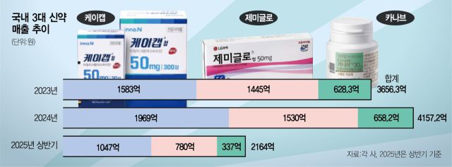 30일 업계에 따르면 HK이노엔(195940)의 위식도역류질환 치료제 ‘케이캡’, LG화학(051910)의 2형 당뇨병 치료제 ‘제미글로’, 보령(003850)의 고혈압 치료제 ‘카나브’의 올해 상반기 원외처방 합산액은 2164억 원으로 집계됐다. 지난해 같은 기간의 1976억원보다 9.5% 늘었다.