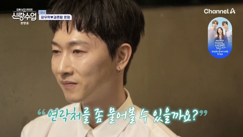 30일 오후 방송된 채널A '요즘 남자 라이프 신랑수업’에서는 장우혁이 배우 이다해의 절친한 후배 배우 오채이와 소개팅하는 모습이 공개됐다.