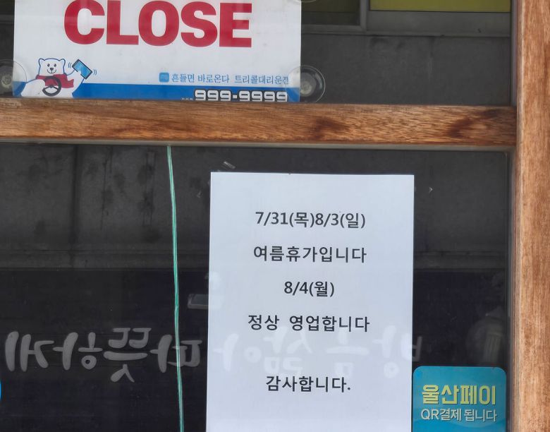 울산 북구 명촌동 식당가에 있는 음식점에 휴가를 알리는 글이 붙어 있다. |