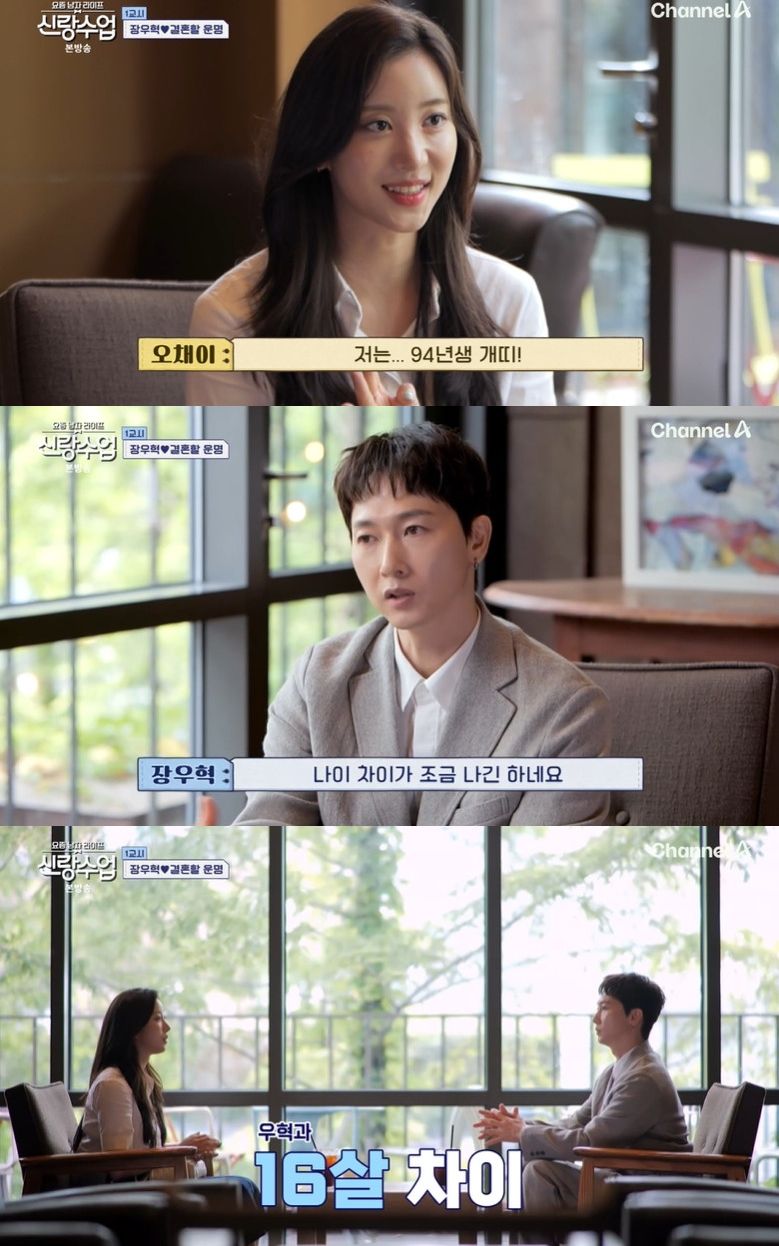 이에 오채이는 "저는 94년생 개띠"라고 답했고, 16살의 나이 차이에 당황한 장우혁은 "나이 차이가 조금 나긴 한다. 저는 지금 4학년 7반 정도 됐다"면서 "어떻게 생각하시냐"고 물었다.