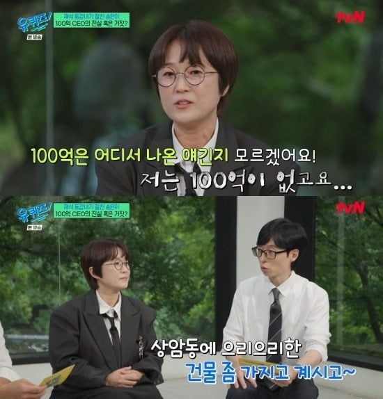 송은이는 “조 단위 자산을 가진 분도 계시는데, 100억이라는 표현은 좀 민망하다”며 너스레를 떨며 손사래를 쳤다. 앞서 유재석에 관해서는 ‘재산 1조설’이 불거진바 있다.