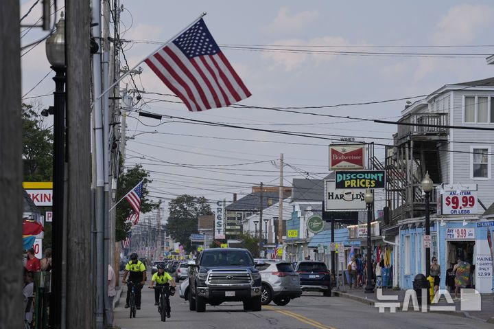 [올드오처드 비치( 미 메인주)=AP/뉴시스] 올드 오처드 비치의 경찰관들이 7월 29일 자전거를 타고 해안 관광지 일대를 순찰하고 있다. 이곳 경찰서 소속의 자메이카 출신의 경찰관이 트럼프대통령의 불법이민 추방정책에 따라 이민단속반에 체포되면서 이를 통보받지 못해 실종으로 여겼던 경찰들이 항의하는 소동이 벌어졌다. 2025. 07.31. |