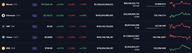 31일 글로벌 가상자산 시황중계 사이트 코인마켓캡에 따르면 이날 오전 8시 15분 기준 비트코인 가격은 24시간 전 대비 0.26% 내린 11만 7542달러를 기록했다. 일주일 전과 비교하면 1.02% 하락했다. 알트코인(비트코인 외 가상자산)의 대표격인 이더리움은 전일 대비 0.26% 하락한 3780달러에 거래됐다.