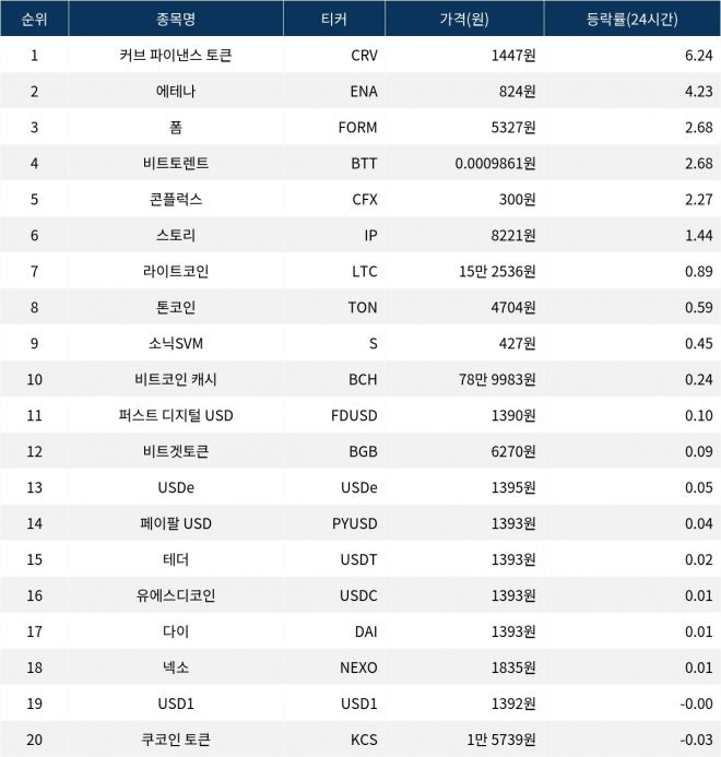 글로벌 가상자산 시황 중계 사이트 코인마켓캡(CoinMarketCap)에 따르면, 24시간 동안 상승세를 보인 가상자산 중 커브 파이낸스 토큰(CRV)이 가장 높은 상승률을 기록했다. 커브 파이낸스 토큰은 6.24% 상승하며 1447원에 거래되고 있다. 커브 파이낸스는 탈중앙화 금융(DeFi) 분야에서 유동성 제공과 스테이블코인 교환을 주로 다루는 플랫폼으로, 그 활용도가 높아지면서 투자자들의 관심을 끌고 있다. 해당 토큰의 시가총액은 약 1조 9791억 원에 달한다.