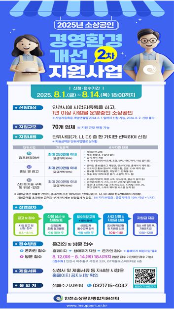 (문화뉴스 김인환 기자) 인천광역시가 지역 소상공인의 경영 위기 극복을 위해 '2025년 2차 소상공인 경영환경개선 지원사업'을 시행한다. 모집은 8월 1일부터 14일까지이며, 약 70개 업체가 선정될 예정이다.