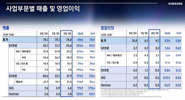 삼성전자는 2025년 2분기 한국채택국제회계기준(K-IFRS) 연결기준 매출액 74조6000억원 영업이익 4조7000원을 달성했다고 31일 밝혔다.
