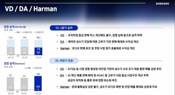 영상디스플레이(VD)사업부 및 디지털어플라이언스(DA)사업부 매출액과 영업이익은 각각 14조1000억원과 2000억원이다. 매출액은 전기대비 3% 전년동기대비 2% 부족했다. 영업이익은 전기대비 33% 전년동기대비 60% 급락했다. VD사업부 매출액은 7조원이다. 전기대비 10% 전년동기대비 7% 미달했다.