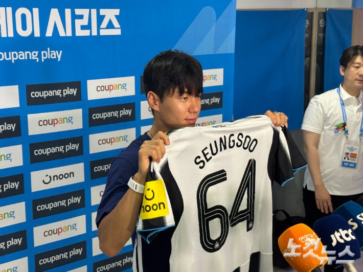 전진우는 "(박)승수가 이적하고 데뷔전을 치른 유니폼인데, 나랑 바꿔서 정말 영광이다"라며 "승수에게 고맙다는 말을 전하고 싶다"고 말했다.