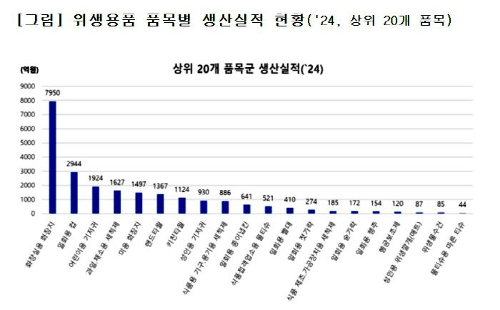 2024년 위생용품의 국내 생산액은 ▲화장지 9447억 원(41.0%) ▲일회용 컵 2944억 원(12.8%) ▲일회용 기저귀 2941억 원(12.8%) ▲세척제 2698억 원(11.7%) ▲일회용 타월 2492억 원(10.8%) 순으로 높았으며, 해당 5개 품목이 전체 생산액의 약 89%를 차지했다.