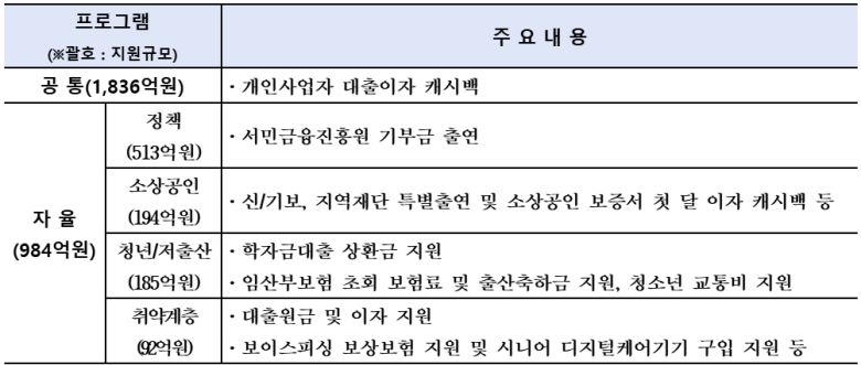 먼저, 우리은행은 1836억원 규모의 공통프로그램을 통해 소상공인과 자영업자 21만명에 이자 캐시백을 지원했다. 984억원 규모의자율프로그램으로는 ▲청년 학자금대출 상환금 지원 ▲임산부보험 초회보험료 및 출산축하금 지원 ▲서민금융대출 성실 상환자 캐시백 ▲청소년 교통비 지원 등 취약계층 별 맞춤형 지원을 제공했다.