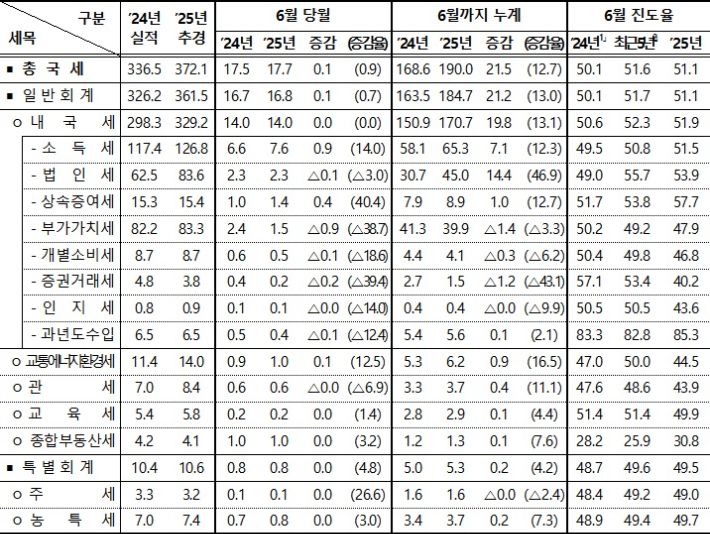 상반기 법인세 수입은 14.4조, 소득세 수입은 7.1조 늘어