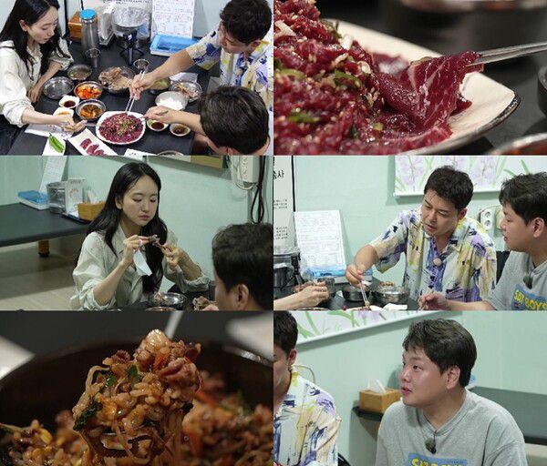 전현무와 원진아가 의외의 케미를 내뿜은 상황 속에서 식당에 자리잡고 앉은 세 사람은 간장 육회, 우낙 돌비, 한우 찐 생비 등 이름도 생소한 신박한 메뉴 한 상을 받는다. 곧바로 먹방에 돌입한 세 사람은 “이렇게 싱싱한 육회를 듬뿍 올린 비빔밥은 처음” “낙지와 한우가 돌솥에 살짝 익어서 딱 맛있다” 등 찬사를 터뜨린다.