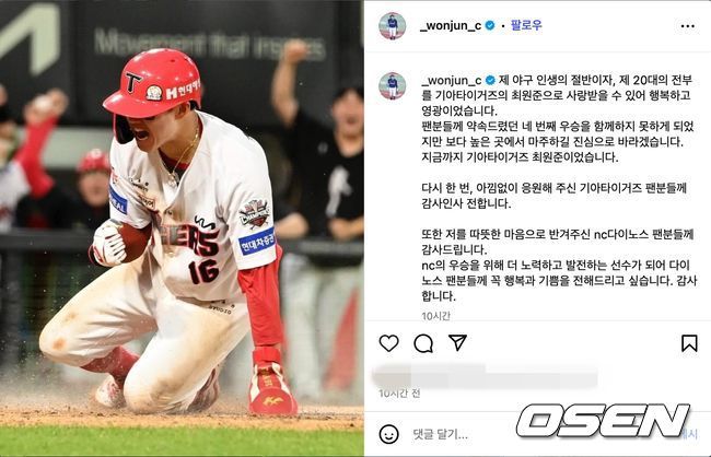 최원준은 지난 30일 자신의 SNS 계정에 KIA 시절 사진과 함께 KIA 팬들을 향한 감사 인사를 전하고 또 NC 선수로서 각오를 다졌다.