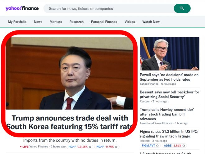 31일 야후 파이낸스 홈페이지를 보면 ‘트럼프, 한국과 15% 관세율 적용 무역 합의 발표’라는 제목의 기사가 홈페이지 메인에 올라와 있다.